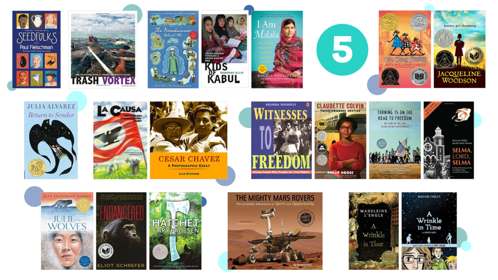Fishtank ELA units place a premium on diverse texts and topics that appeal to students’ natural curiosity about the world. Students see themselves in stories and characters while also learning about other cultures, experiences, and perspectives. For example, in Fishtank ELA’s grade 5 course, students read about plastic pollution, learn about the migrant farm workers movement, and explore the civil rights movement from the perspective of those who lived through it. Each core text on these topics is surrounded by shorter articles to create context and deepen knowledge.